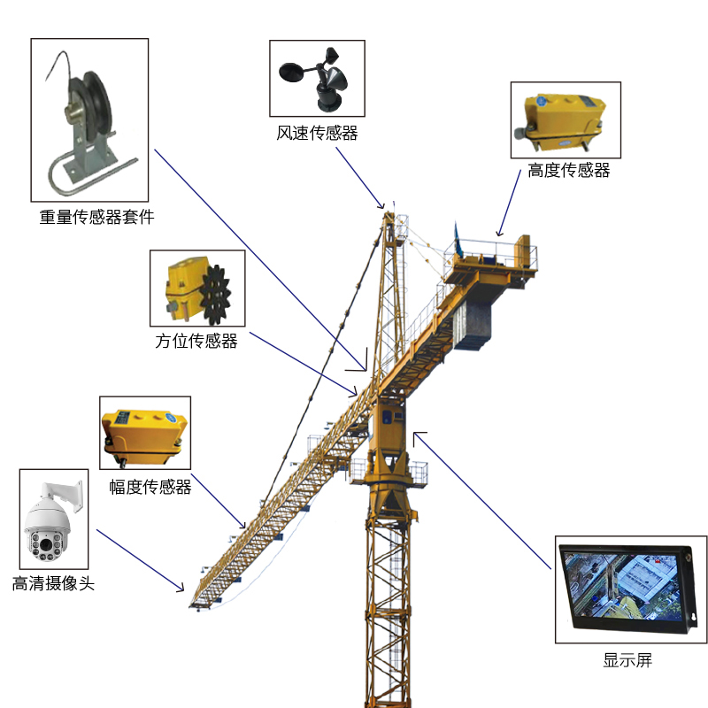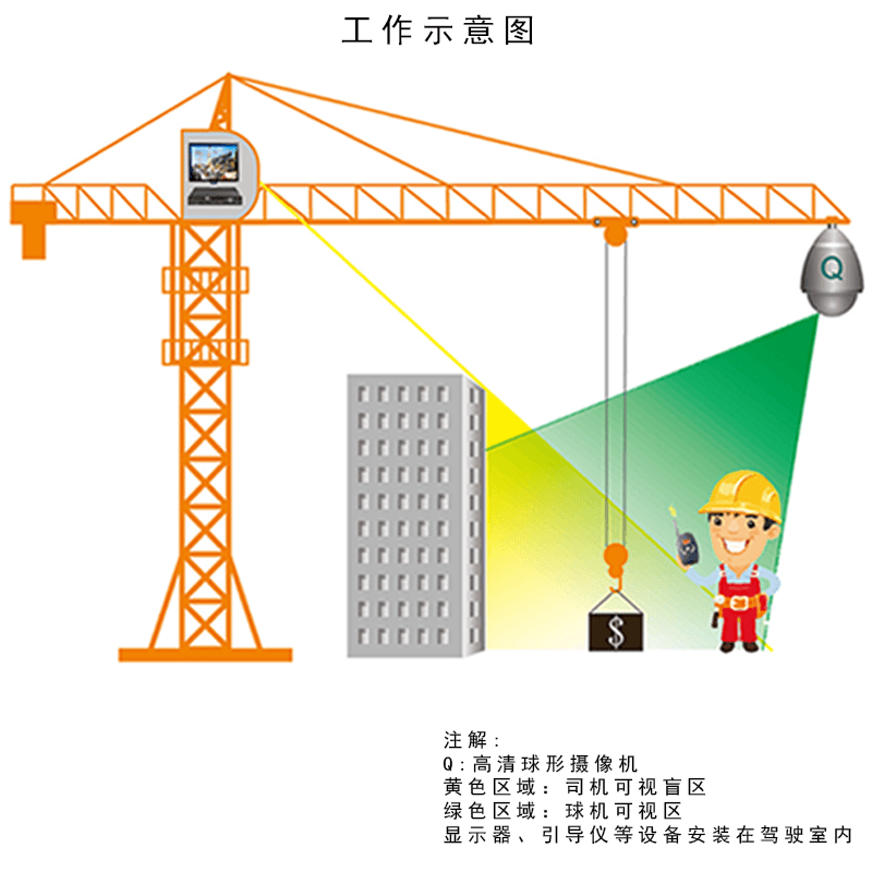 该系统由摄像头、显示器及其他可选配辅助硬件及系统组成,捕捉塔吊吊钩作业影像显示在安装在塔吊司机室的显示器上,延伸塔司视觉,以便塔吊司机一目了然地看到吊钩及所吊物品的状态。