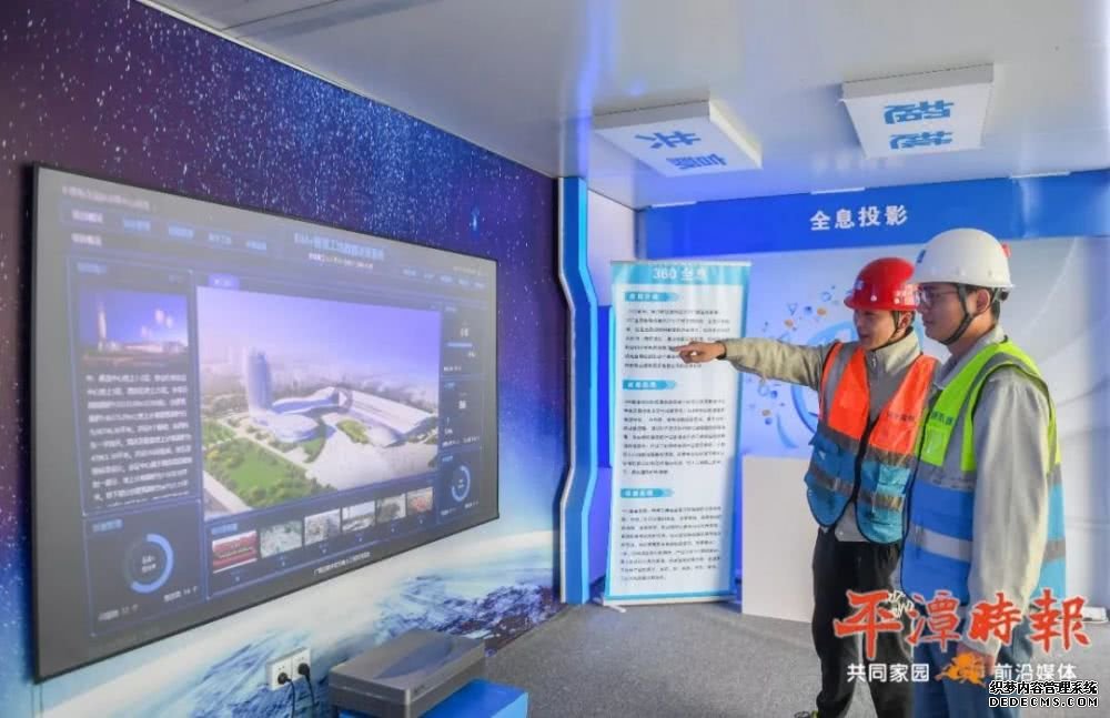 张喜旺在现场就通过手机上传施工整改信息单至后台大屏。大屏上呈现出密密麻麻的设计线条、彩色三维图,精准勾勒出项目主体的“脉络筋骨”,上面还显示着工地内的实时视频和各种数据,“360度”呈现出工地全貌。